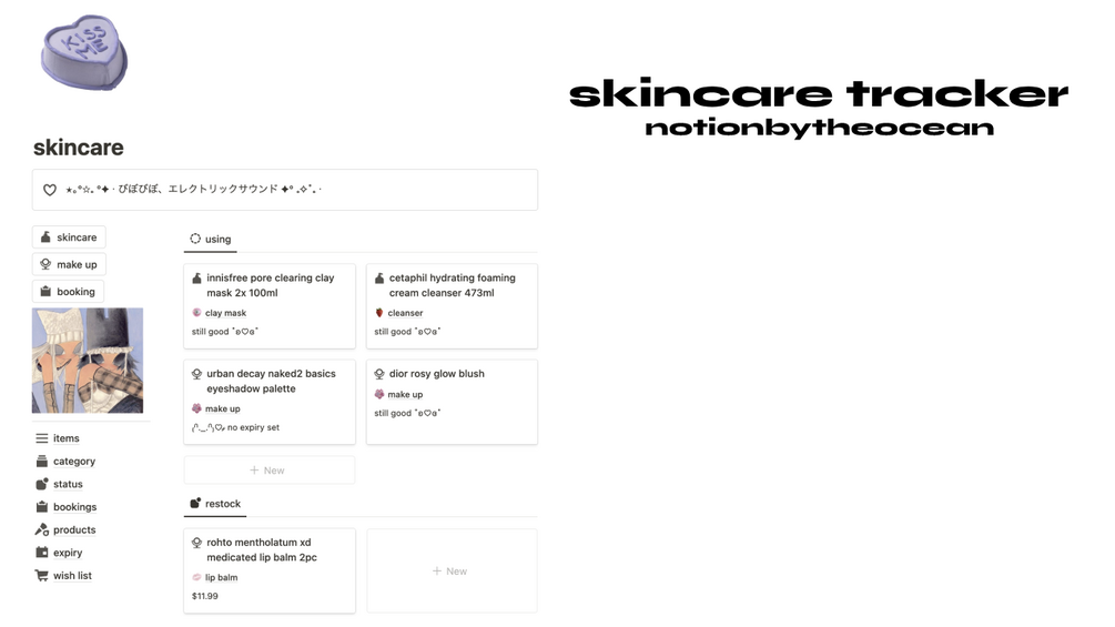 skincare tracker notion template in ~ cutecore aesthetic ~